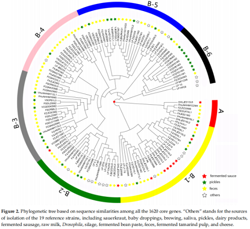 分离菌株:采集324份样品(126份泡菜、32份发酵酱、166份人类粪便),分离获得114株植物乳杆菌,结合NCBI数据库19株参考菌株,共133株进行比较分析。