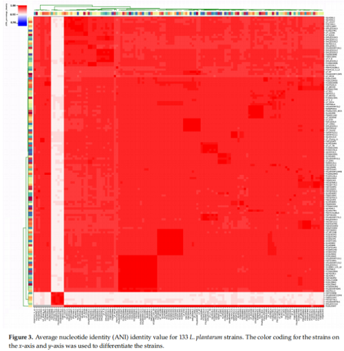 ANI是判断菌株是否为同一物种的核心指标(通常阈值96%),研究中泡菜源菌株间ANI值普遍>99%(如重庆泡菜源8株菌株ANI值99.23%),发酵酱源菌株间 ANI值>99%(如黑龙江发酵酱源菌株),表明同一食品来源菌株遗传相似度极高;泡菜源与发酵酱源菌株间ANI值98.85%-99.02%,低于同来源菌株但高于种水平阈值,提示两者虽为同一物种,但因长期适应不同食品基质(植物纤维vs蛋白质)产生遗传分化;A簇6株菌株与B簇127株菌株间最大ANI值仅95.23%,接近但低于96%阈值,推测A簇菌株可能为植物乳杆菌属内的独立亚种,需进一步实验验证。