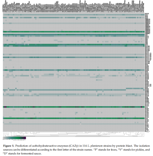 对114株分离菌株的碳水化合物活性酶(CAZy)进行预测,发现不同分离源菌株的CAZy家族分布存在明显差异(“F”粪便、“V”泡菜、“D”发酵酱)。例如,粪便来源菌株可能含有更多适应肠道碳水化合物代谢的CAZy酶,发酵食品来源菌株可能富集与食品基质降解相关的酶类,为植物乳杆菌的功能应用场景选择提供了直接依据。