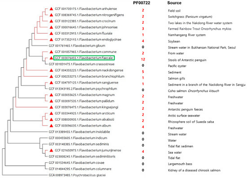 ANI分析显示,F. faecale WV33ᵀ与26株黄杆菌属模式菌株的ANI值为 0.66-0.91(ANIblastall 算法),均低于96%的种水平阈值,明确其为黄杆菌属中的独立新物种;系统发育树进一步表明,WV33ᵀ与南极企鹅粪便来源的Flavobacterium kingsejongi亲缘关系最近(分支距离最短),推测两者在极端低温环境(南极)中共同进化,形成相似的遗传适应特征(如低温适应基因)。