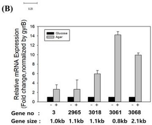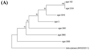 在WV33ᵀ基因组中鉴定出7个putative琼脂酶基因(agar.3、agar.162、agar.2965、agar.3018、agar.3061、agar.3068、agar.3154),均含完整开放阅读框与GH16家族功能结构域(琼脂酶核心结构域)。RT-qPCR分析显示,在以琼脂为唯一碳源的培养基中5个琼脂酶基因(agar.3、agar.2965、agar.3018、agar.3061、agar.3068)的表达量显著上调,其中agar.3061表达量最高(是葡萄糖组的14倍);基因敲除实验进一步证实,agar.3018与 agar.3061敲除后,菌株琼脂糖降解活性下降70%-80%,而互补菌株可恢复活性,表明这两个基因为 WV33ᵀ琼脂糖降解的关键基因,为后续基因工程改造(如提高琼脂酶产量)提供明确靶点。