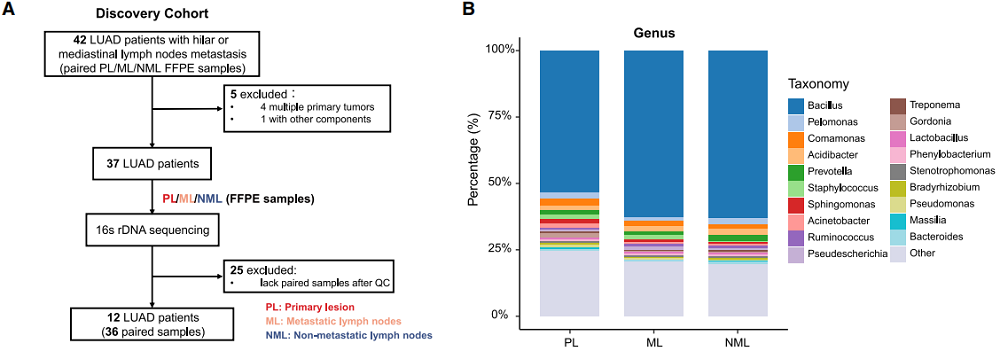 1.16S rRNA基因测序:对LUAD患者原发灶、转移淋巴结、非转移淋巴结样本进行16S rRNA基因高通量测序,完成菌群组成的初步筛选;