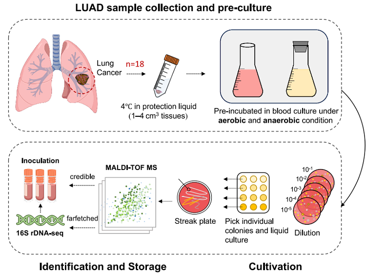 2.微生物培养组学:采用多培养条件(好氧/厌氧+5%羊血/5%瘤胃液)对LUAD原发灶新鲜样本进行富集培养,分离获得患者来源的纯细菌菌株;