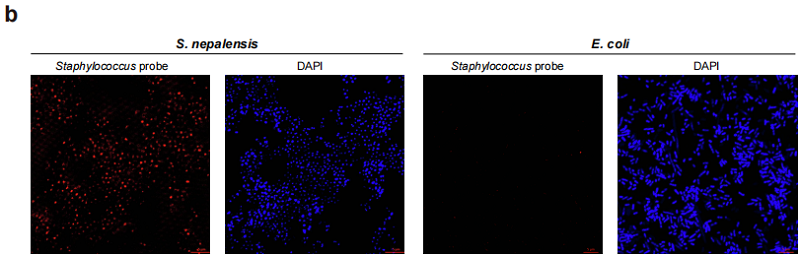 (b) 荧光原位杂交(FISH)探针标记的尼泊尔葡萄球菌和大肠杆菌荧光图像