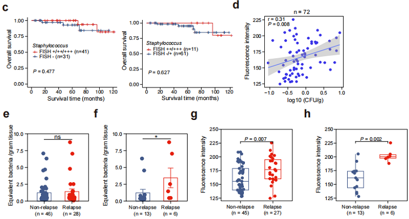 (g, h) 验证队列1中不同复发状态肺腺癌患者的葡萄球菌FISH荧光强度柱状图