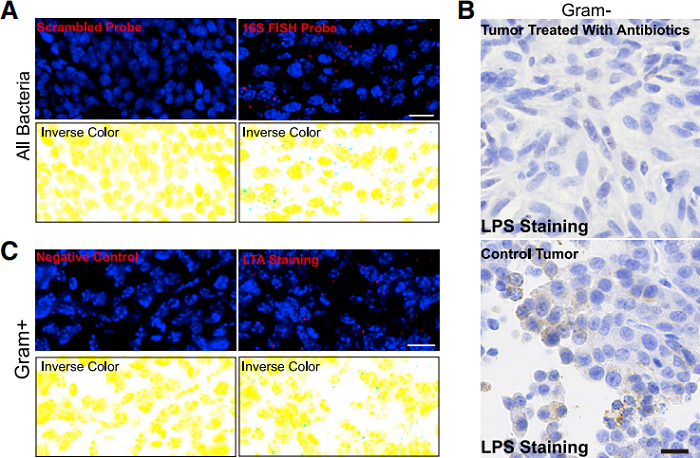 (A) 16S FISH分析(红色)显示细菌在核周区域呈点状分布;(B) LPS IHC染色(革兰氏阴性菌,红色);(C)LTA染色(革兰氏阳性菌,红色),蓝色为DAPI染核。