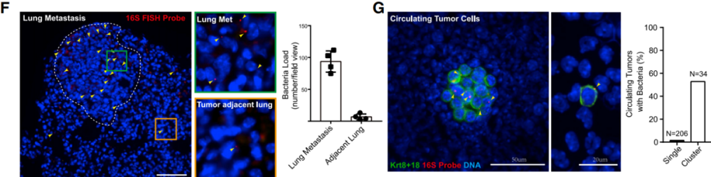 (G) 血液中角蛋白8+18抗体和16S探针染色和定量循环肿瘤细胞中的细菌。