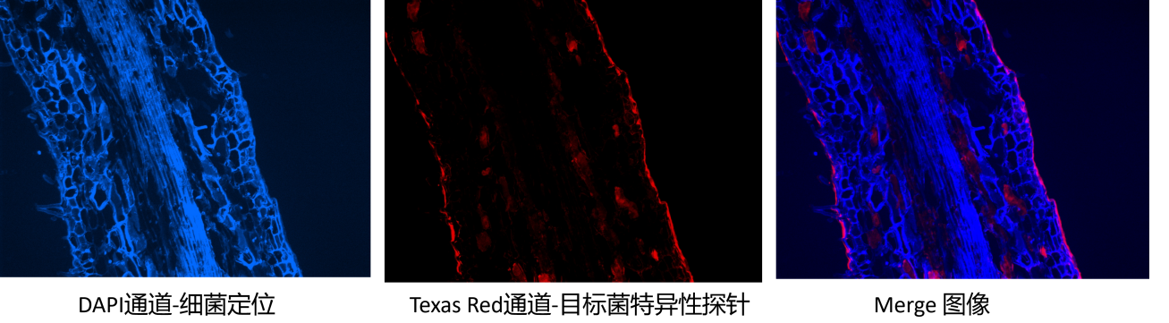 蓝色荧光(DAPI染色):呈现根系样本中所有细菌的整体分布;红色荧光(FISH探针标记):定位目标功能微生物。图像叠加可直接观察目标菌在总群落中的位置与占比,快速判断目标菌的存活状态与富集情况。