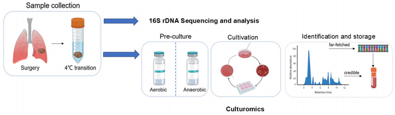 本研究联用测序+培养组学分析肺癌组织菌群:测序可揭示微生物组成,培养组学既能部分验证测序结果,更能获得可用于后续研究的活菌;研究首次通过培养法从肺癌组织分离菌株并完成体外功能验证。
