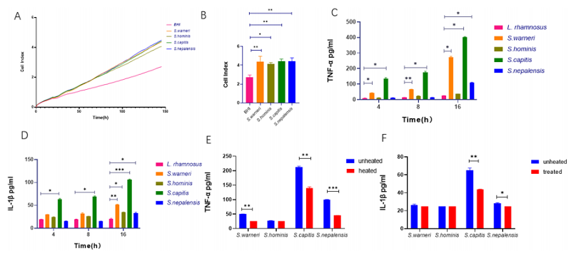 B刺激148小时后细胞指数统计分析;C四株菌与THP-1共培养上清中TNF-α含量;