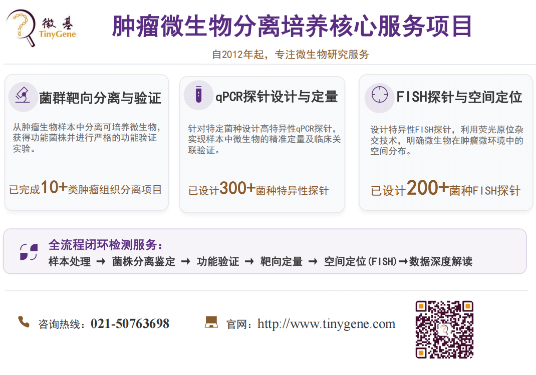 微基生物可提供肿瘤微生物样本处理、有氧/厌氧分离培养、16S rDNA测序与菌株精准鉴定、细菌培养上清代谢物分析等服务,并围绕肿瘤微生物研究特点,提供实验设计、样本采集、方法选择及结果解析的全流程技术咨询,助力提升菌株分离效率与功能验证准确性。