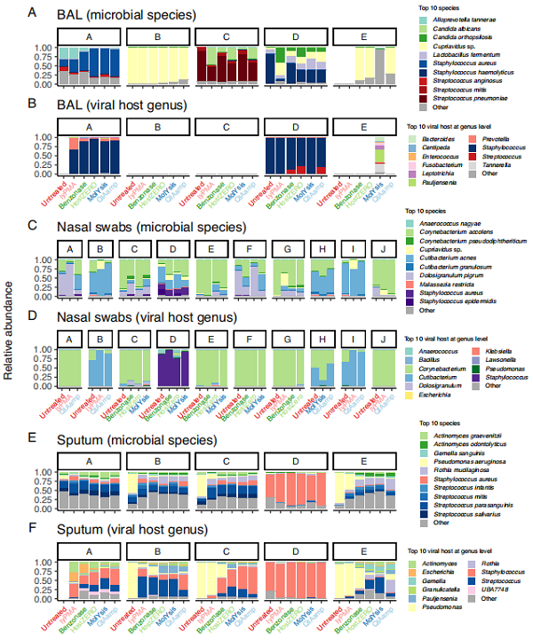 E/F:pwCF患者痰液样本,E为前10非病毒微生物物种,F为前10病毒宿主属;